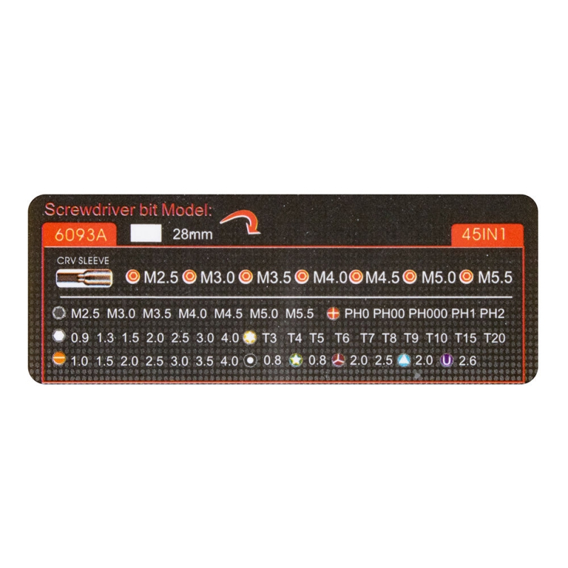 مجموعه پیچ گوشتی 6093A با 45 عدد سری مختلف و قابل تطبیق با کار در زمینه های مختلف. از فولاد کروم وانادیوم با کیفیت بالا ساخته شده است. طول قابل تنظیم دسته باعث می شود کارهای مختلف را به راحتی انجام داد.این پیچ گوشتی ها دارای طراحی ارگونومیک بوده و به طور گسترده برای اکثر محصولات دیجیتال مانند کامپیوتر، تلفن همراه، دوربین، عینک و ساعت استفاده می شود.